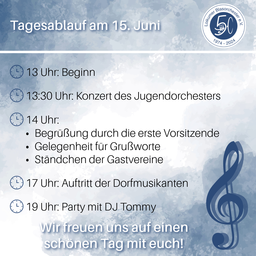 Zum Jubiläumstag mit vielen Gästen und befreundeten Musikvereinen ist am Samstag, 15. Juni, ab 13 Uhr auf den Hof Dräger (Mehrbruch 1, Loikum), eingeladen. Im Laufe des Nachmittags werden einige Grußworte vorgetragen und befreundete Gastvereine haben die Gelegenheit ein musikalisches Ständchen zu bringen. Als Specialguest werden Die Dorfmusikanten den Abend einleiten und im Anschluss wird DJ Tommy übernehmen. Auch die kleinen Gäste werden mit einer Hüpfburg auf Ihre Kosten kommen. Des Weiteren wird mit Kaffee, Kuchen, Pommes-Wagen und vielem Mehr für das leibliche Wohl gesorgt sein.